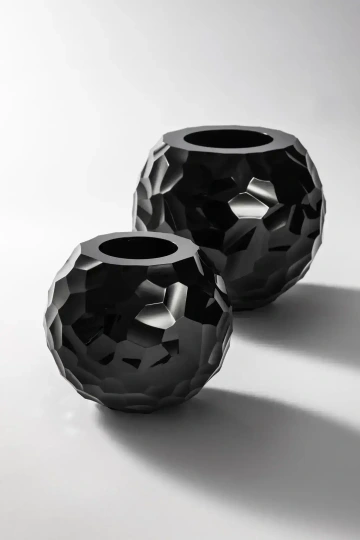 Beautiful round shapes decorated with cut stones. The Beauty vase turned into a dark, shiny gem. The unique color, which looks black, was dark purple while creating process. Try to discover the purple reflections when looking through it to direct sun.