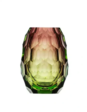 Caorle is a beautiful historic town near Venice, but also a collection of mouth-blown cut vases and bowls inspired by the beauty of the town. The Caorle vase is specific by combining underlaid tones of ocean green and rose into a singular harmony. The design of the vase originated in 2015 and is rendered by more than ten pairs of hands. Height of vase 13 cm.