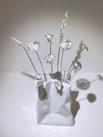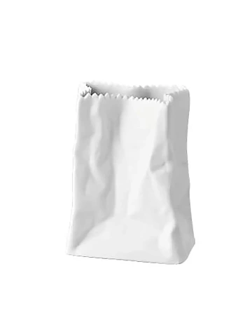 The imaginative, snow-white glazed Rosenthal porcelain vase is 9 cm tall and shaped like a paper bag. The glossy City Bag mini vase is based on the design of the eponymous Bag vase by the German brand Rosenthal. The witty idea of making a vase shaped like a paper grocery bag stands out despite the small height. The designer, Cairn Young (1963), has been one of the most prominent British designers for years.