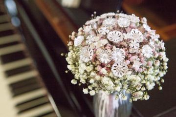 With seasonal fresh or dried flowers (included in the price). The wedding bouquet is always delivered tied up