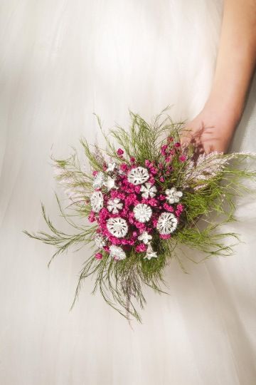 With seasonal fresh or dried flowers (included in the price). The wedding bouquet is always delivered tied up