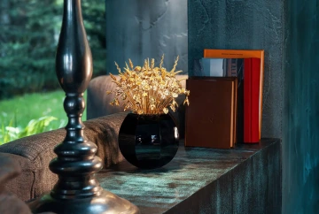 Beautiful round shapes decorated with cut stones. The Beauty vase turned into a dark, shiny gem. The unique color, which looks black, was dark purple while creating process. Try to discover the purple reflections when looking through it to direct sun.